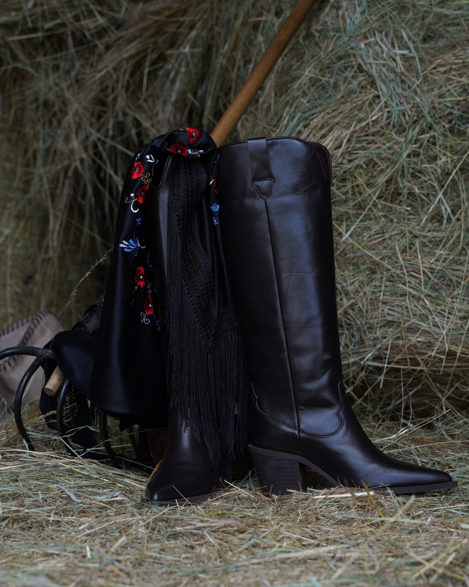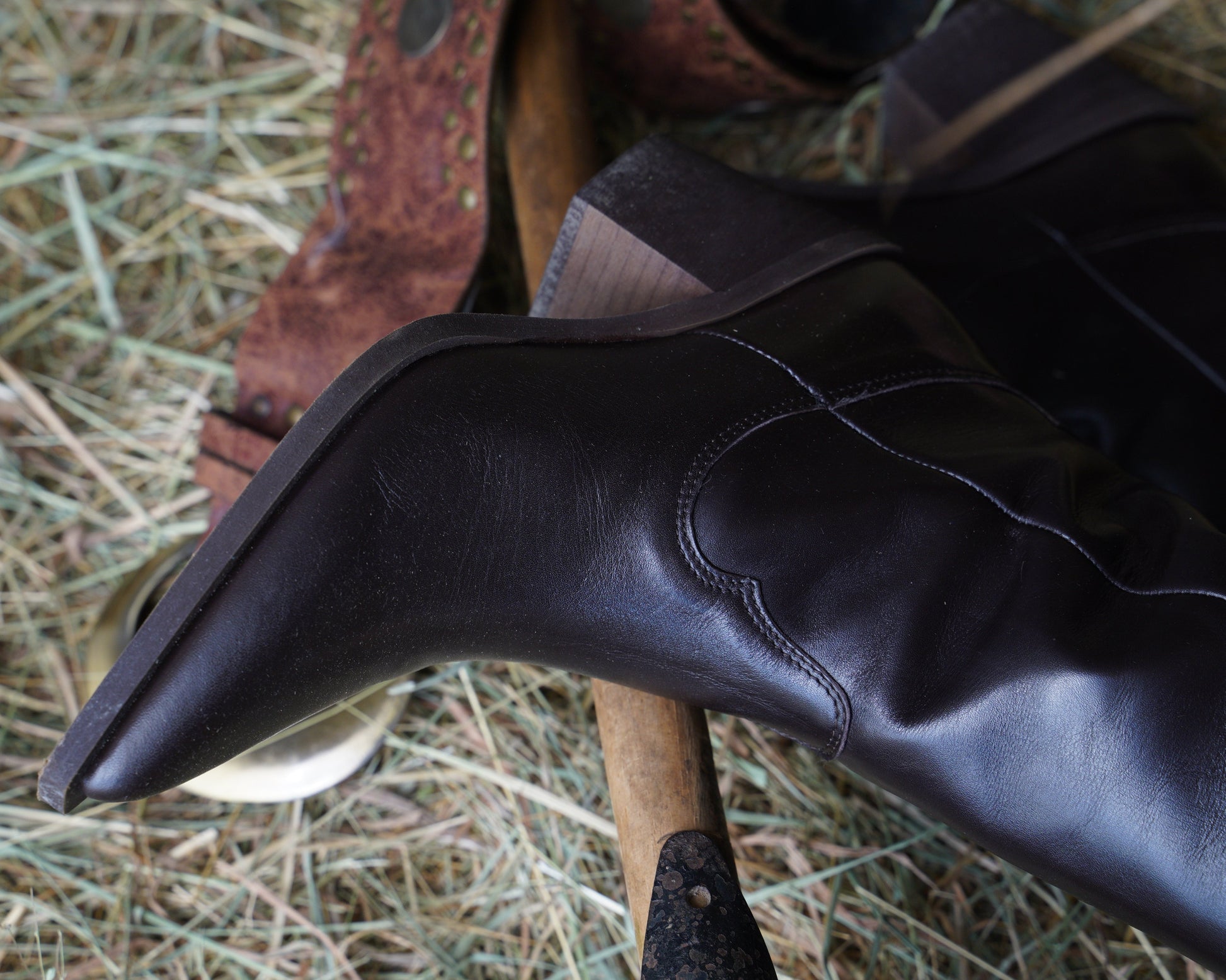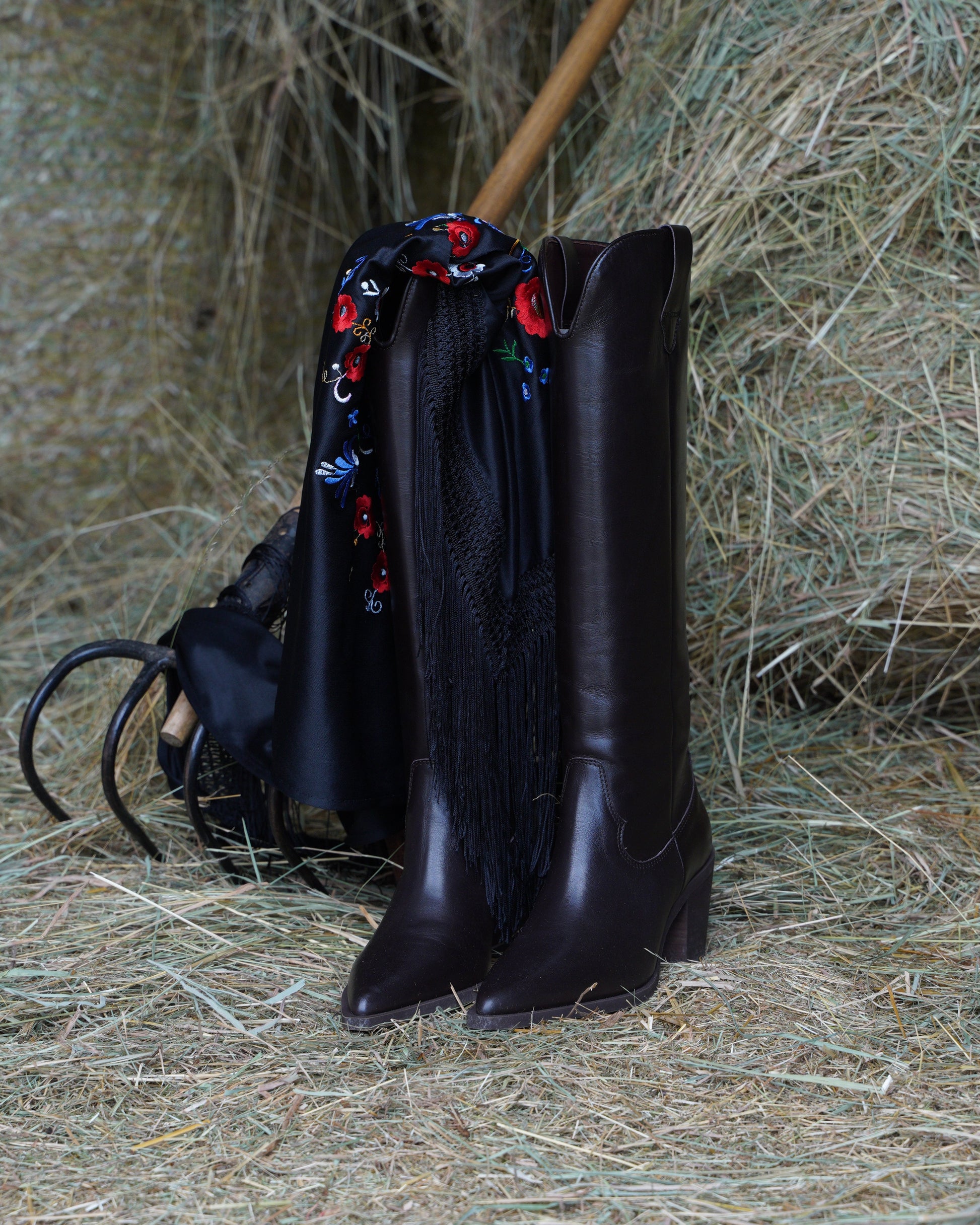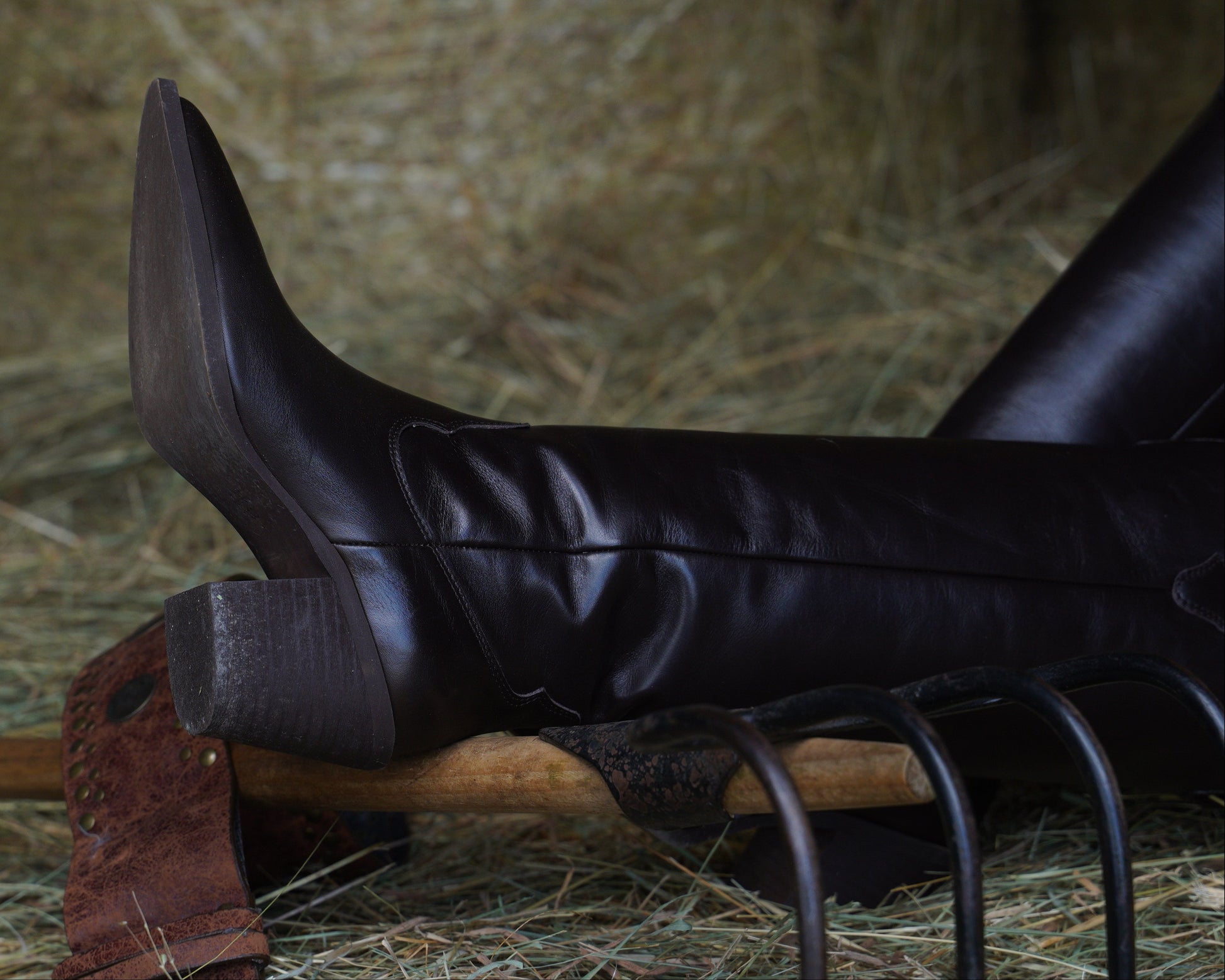 Botas estilo texanas de cano alto, em pele genuína castanho chocolate, de salto médio. Contém presilhas no topo.