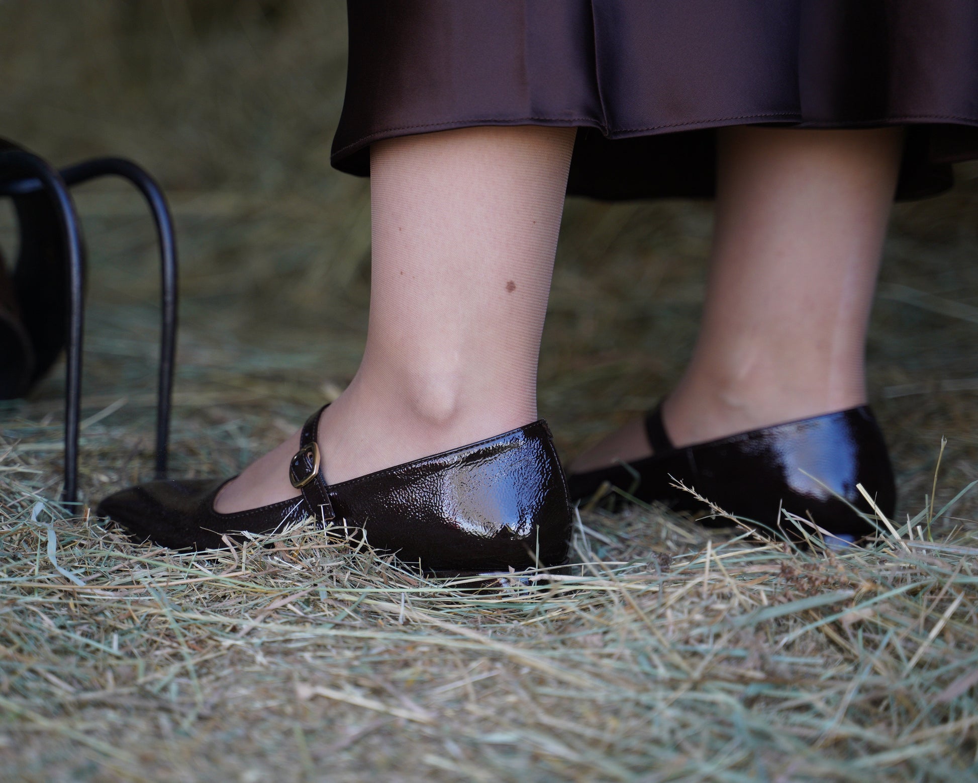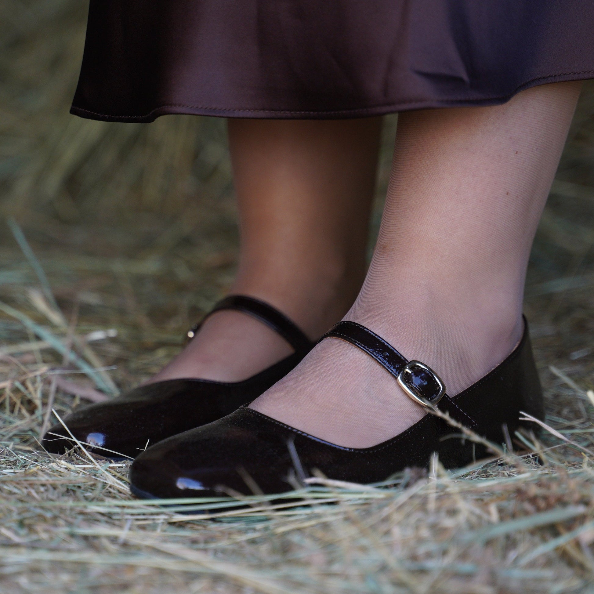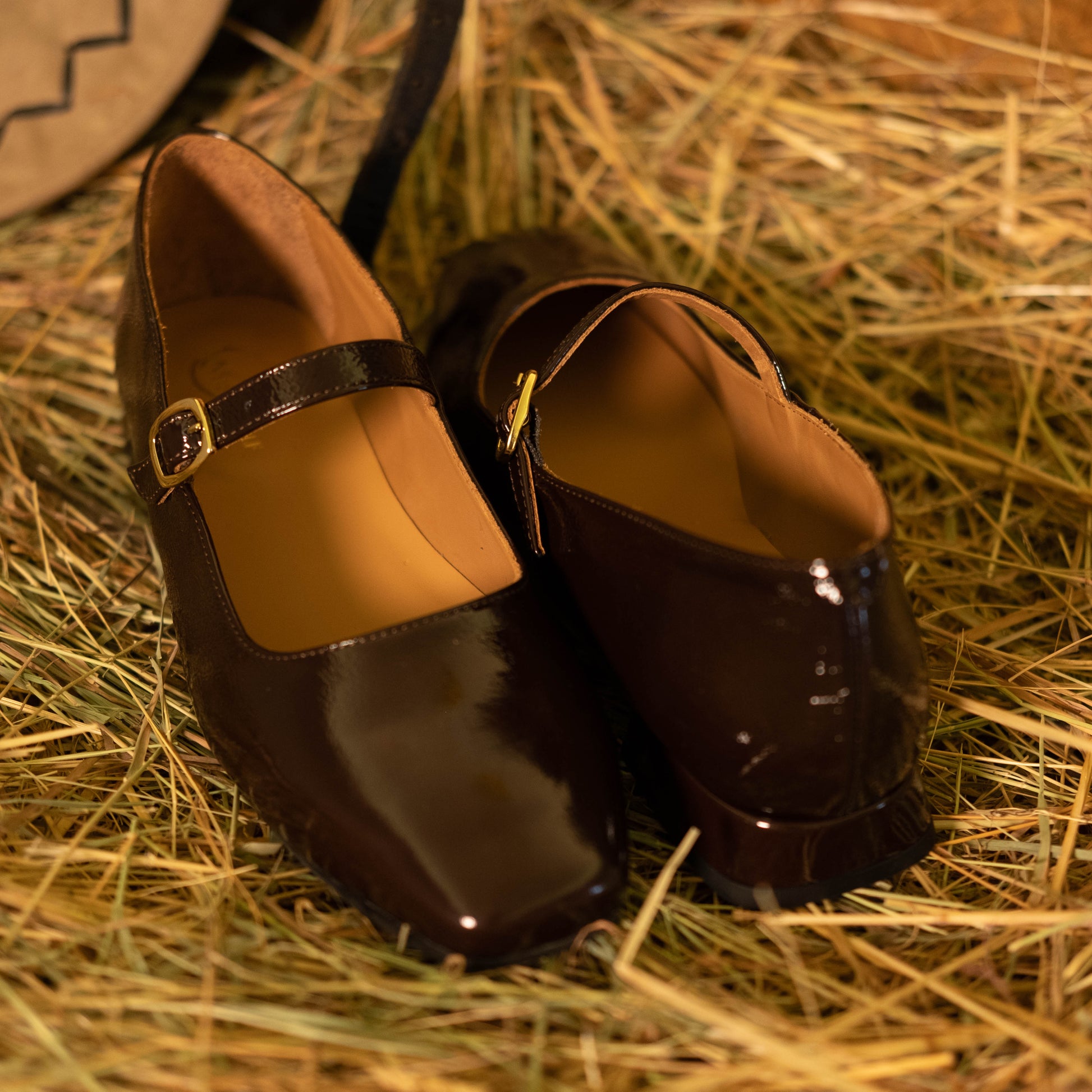 Sabrinas de forma quadrada, em pele-verniz castanho chocolate, com salto baixo. Contém tira no peito do pé ajustável com fivela dourada.